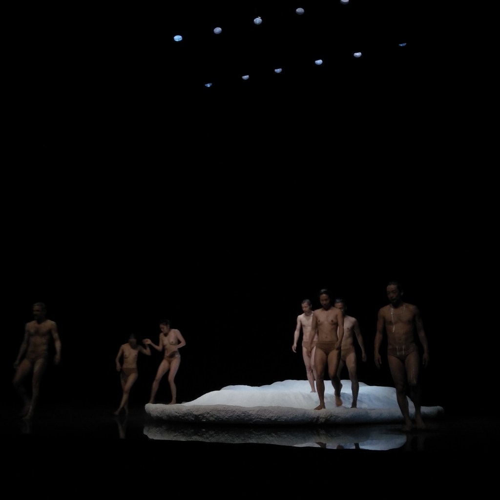 A rare, complete darkness. Curtain slides discreetly. Soothing smell of water. Barely noticeable is the human breathing in the Salle Vilar of Théâtre National de Bretagne (TNB). The darkness seems to last, as long as the beginning of 2001: A Space Odyssey. Finally, in the middle of the darkness appeared a dim spotlight which gently brightened the stage: a white island, water and three groups of creatures.